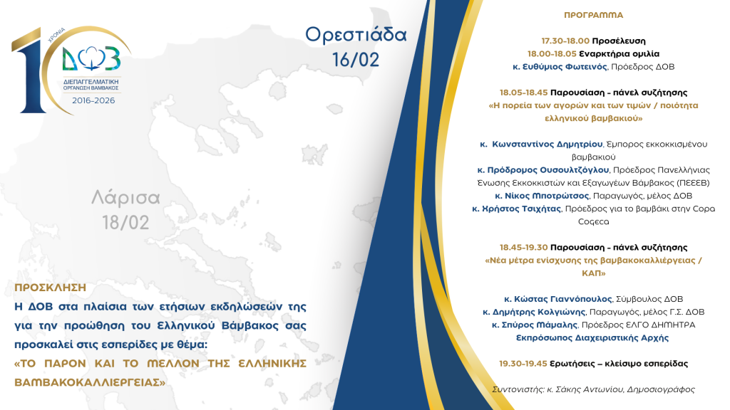 Τη Δευτέρα 16 Φεβρουαρίου και ώρα 18.00 (προσέλευση: 17.30) θα πραγματοποιηθεί η 1η εσπερίδα της Διεπαγγελματικής Οργάνωσης Βάμβακος (ΔΟΒ) για το 2026, στην Ορεστιάδα («Δημοκρίτειο Πανεπιστήμιο Θράκης», Αμφιθέατρο «Ζαφείρης Άμπας») με τίτλο: «Το παρόν και το μέλλον της ελληνικής βαμβακοκαλλιέργειας» στα πλαίσια των ετήσιων εκδηλώσεων της Διεπαγγελματικής για την προώθηση του Ελληνικού Βαμβακιού.