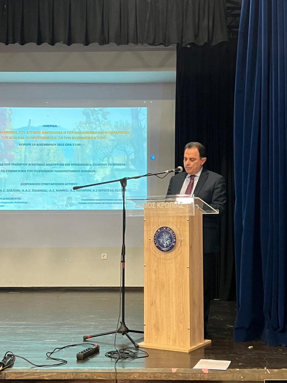 Ο κ. Γεωργαντάς υπενθύμισε ότι ο Αττικός Αμπελώνας αποτελεί τον μεγαλύτερο και ιστορικότερο αμπελώνα της Ελλάδας καθώς αριθμεί μια έκταση άνω των 62.000 στρεμμάτων ωστόσο από το 2003 μέχρι το 2021 ο Αττικός Αμπελώνας έχει μειωθεί κατά 50%. Το 2003 καλλιεργούντο 112.447 στρέμματα, ενώ το 2021 καλλιεργούντο 62.230 στρέμματα.