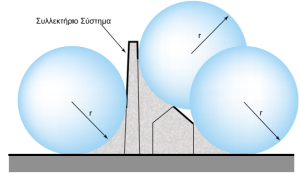 β) Η μέθοδος της κυλιόμενης σφαίρας: Με αυτή τη μέθοδο προσδιορίζονται τα πιθανά σημεία τερματισμού ενός κεραυνικού πλήγματος κυλίοντας προς όλες τις δυνατές κατευθύνσεις γύρω από την υπό προστασία κατασκευή μια σφαίρα με ακτίνα ίση με την απόσταση πρόσκρουσης rb, στο κέντρο της οποίας βρίσκεται η κεφαλή του κατερχόμενου κεραυνικού οχετού. Από το άμεσο κεραυνικό πλήγμα προστατεύονται αντικείμενα που βρίσκονται κάτω από την κυρτή επιφάνεια της σφαίρας, ενώ μένουν απροστάτευτα αντικείμενα που αγγίζουν ή διεισδύουν στην επιφάνεια της κυλιόμενης σφαίρας, όπως φαίνεται στο σχήμα 2 β.