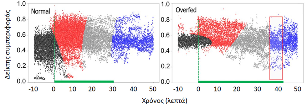 Το δεξί διάγραμμα δείχνει τις αντίστοιχες συμπεριφορές όταν χορηγείται στα ψάρια περισσότερη τροφή. Σ’ αυτή την περίπτωση βλέπουμε πως η συμπεριφορά κορεσμού (μπλε) εμφανίζεται πριν την ολοκλήρωση της χορήγησης τροφής που αποδίδεται με την πράσινη γραμμή.