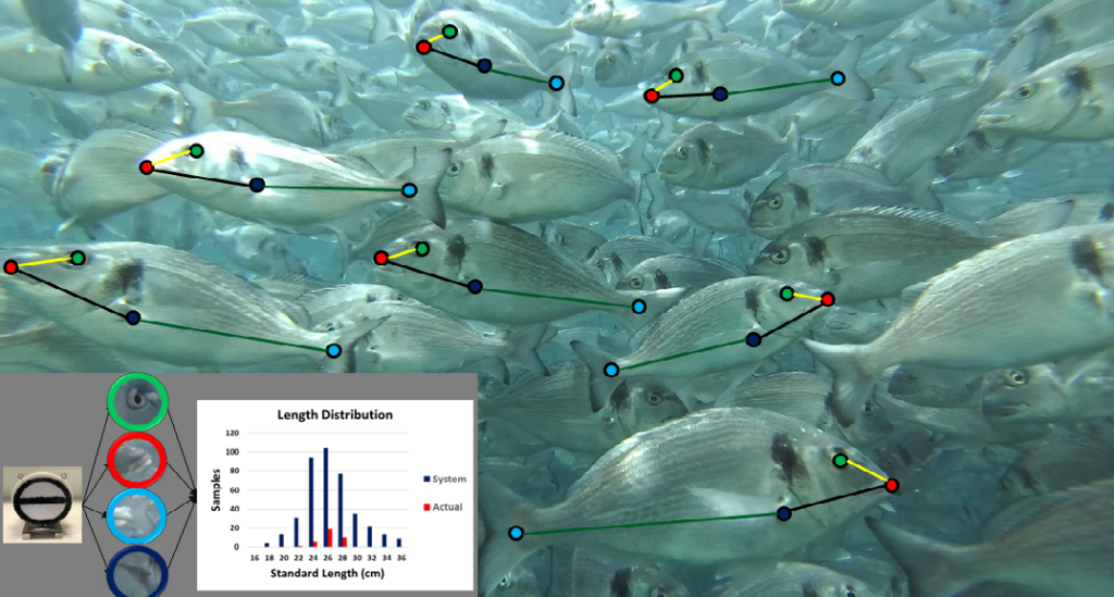 Στο πλαίσιο ενός ευρωπαϊκού προγράμματος στο οποίο συμμετείχαμε, το Performfish, αναπτύξαμε μία στερεοσκοπική κάμερα ώστε να μετράμε το μέγεθος των ψαριών μέσα στο νερό χωρίς ιδιαίτερες διαδικασίες και χωρίς να στρεσάρουμε τα ψάρια. Αυτό μας βοηθά να καταλήξουμε σε συμπεράσματα και για το βάρος αλλά και για την κατανομή μεγεθών του πληθυσμού.
