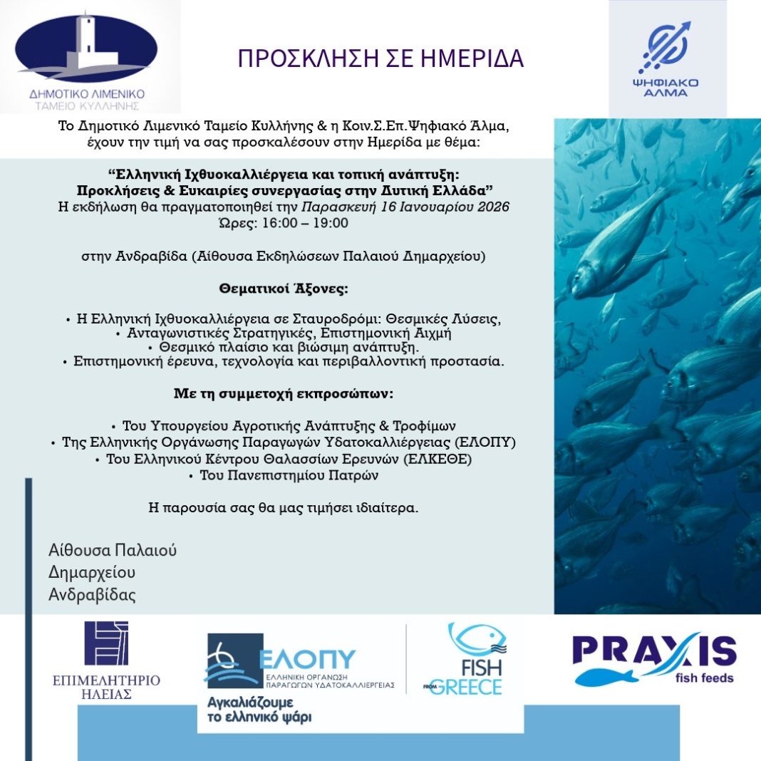 Η ημερίδα με τίτλο «Ελληνική Ιχθυοκαλλιέργεια και τοπική ανάπτυξη: Προκλήσεις & Ευκαιρίες συνεργασίας στην Δυτική Ελλάδα» συνδιοργανώνεται από το Δημοτικό Λιμενικό Ταμείο Κυλλήνης και την Ψηφιακό Άλμα ΚΟΙΝΣΕΠ, με τη στρατηγική υποστήριξη της ΕΛΟΠΥ και της Praxis fish feeds.