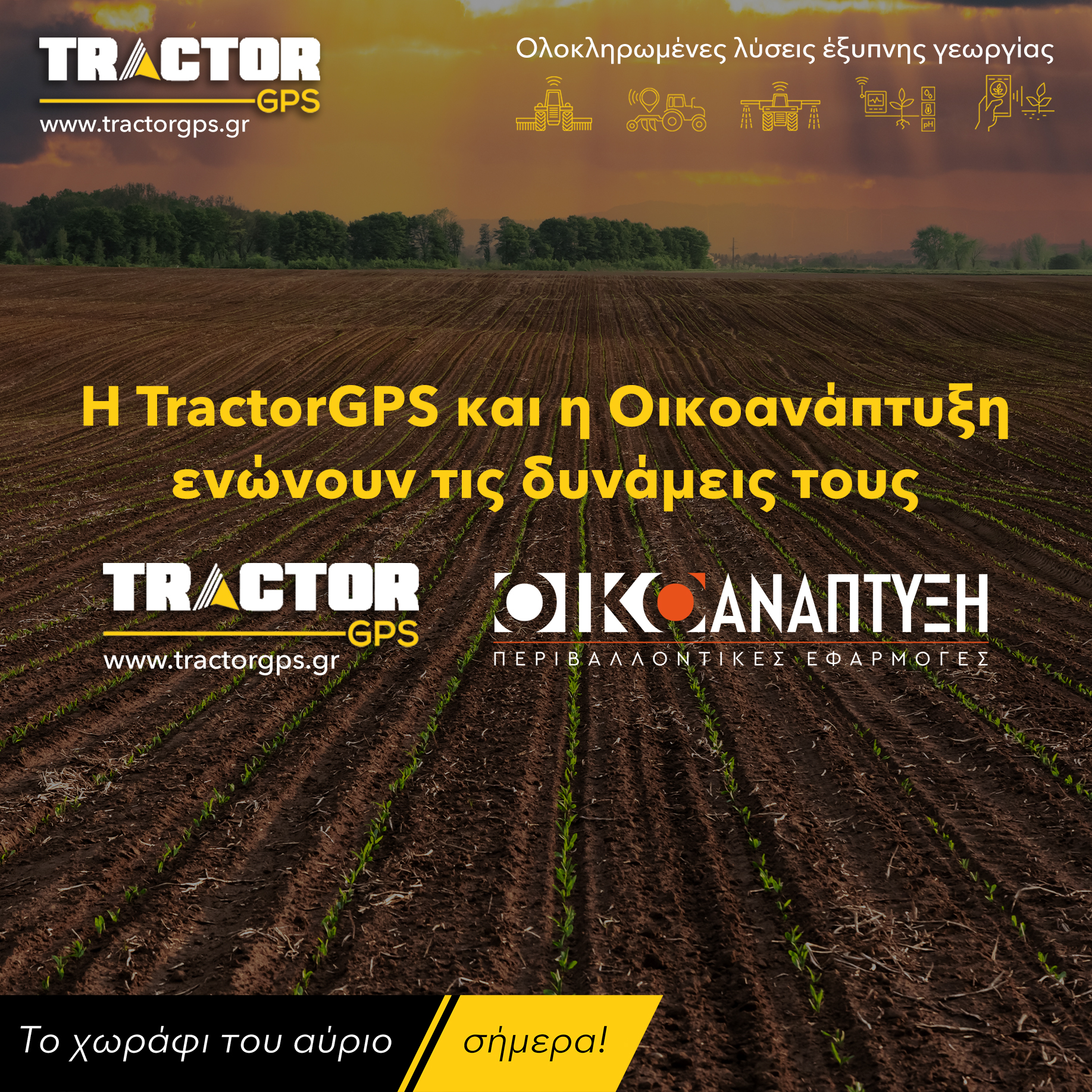 Η TractorGPS, με αντικείμενο και πρωτεύοντα στόχο για πάνω από 10 χρόνια την παροχή πραγματικών και ολοκληρωμένων λύσεων Γεωργίας Ακριβείας, ενοποιεί τις δυνάμεις της με την εταιρία παροχής ψηφιακών αγροτικών υπηρεσιών Οικοανάπτυξη.