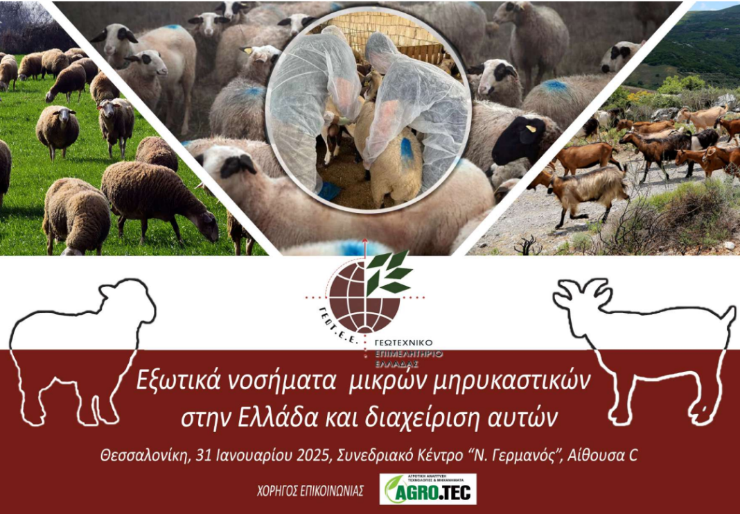 Μία πολύ σημαντική ημερίδα διοργανώνει το Γεωτεχνικό Επιμελητήριο Ελλάδας (ΓΕΩΤ.Ε.Ε.), με θέμα τα «Εξωτικά νοσήματα μικρών μηρυκαστικών στην Ελλάδα και διαχείριση αυτών», την Παρασκευή, 31 Ιανουαρίου 2025, στο πλαίσιο της ZOOTECHNIA 2025, στο Συνεδριακό Κέντρο «Νικόλαος Γερμανός» της HELEXPO-ΔΕΘ, Αίθουσα C, στη Θεσσαλονίκη, από τις 10:30-13:00.