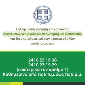 Επίσης, μετά από πρόταση του υπουργού Αγροτικής Ανάπτυξης και Τροφίμων, ο πρόεδρος του ΕΛΓΑ, Ανδρέας Λυκουρέντζος, έδωσε εντολή από την Δευτέρα 20η Νοεμβρίου 2023 και από ώρα 08:00 μέχρι 20:00, να λειτουργούν στο Υποκατάστημα του ΕΛΓΑ Λάρισας, τηλεφωνικές γραμμές υποβολής παρατηρήσεων από τους αγρότες επί των προκαταβολών αποζημιώσεων φυτικής παραγωγής η οποία καταβάλλεται στους λογαριασμούς των δικαιούχων από σήμερα, αλλά και για τις προκαταβολές απώλειας ζωικού κεφαλαίου οι οποίες πληρώθηκαν την 8η Νοεμβρίου.