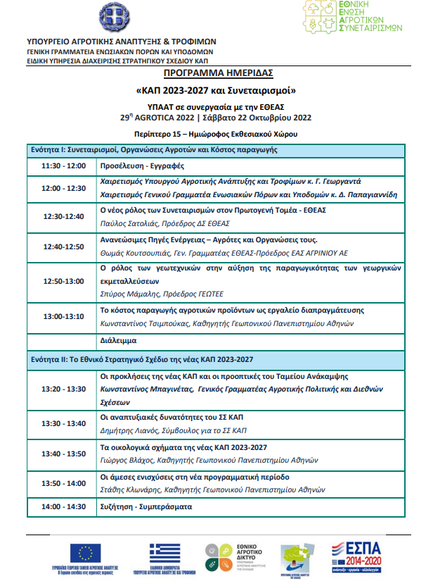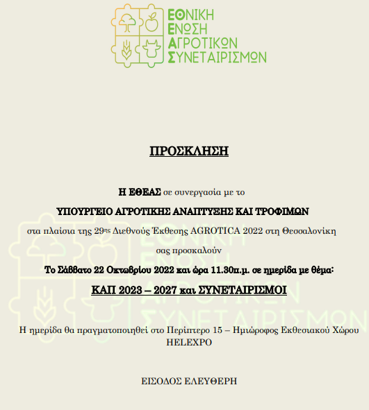 Η ΕΘΕΑΣ σε συνεργασία με το Υπουργείο Αγροτικής Ανάπτυξης και Τροφίμων στα πλαίσια της 9ης Διεθνούς Έκθεσης AGROTICA 2022 στη Θεσσαλονίκη προσκαλούν τους επισκέπτες της AGROTICA το Σάββατο 22 Οκτωβρίου και ώρα 11.30 σε ημερίδα με θέμα: ΚΑΠ 2023-2027 και ΣΥΝΕΤΑΙΡΙΣΜΟΙ. Η ημερίδα θα πραγματοποιηθεί στο περίπτερο 15-Ημιώροφος Εκθεσιακού Χώρου HELEXPO. Η είσοδος είναι ελεύθερη.