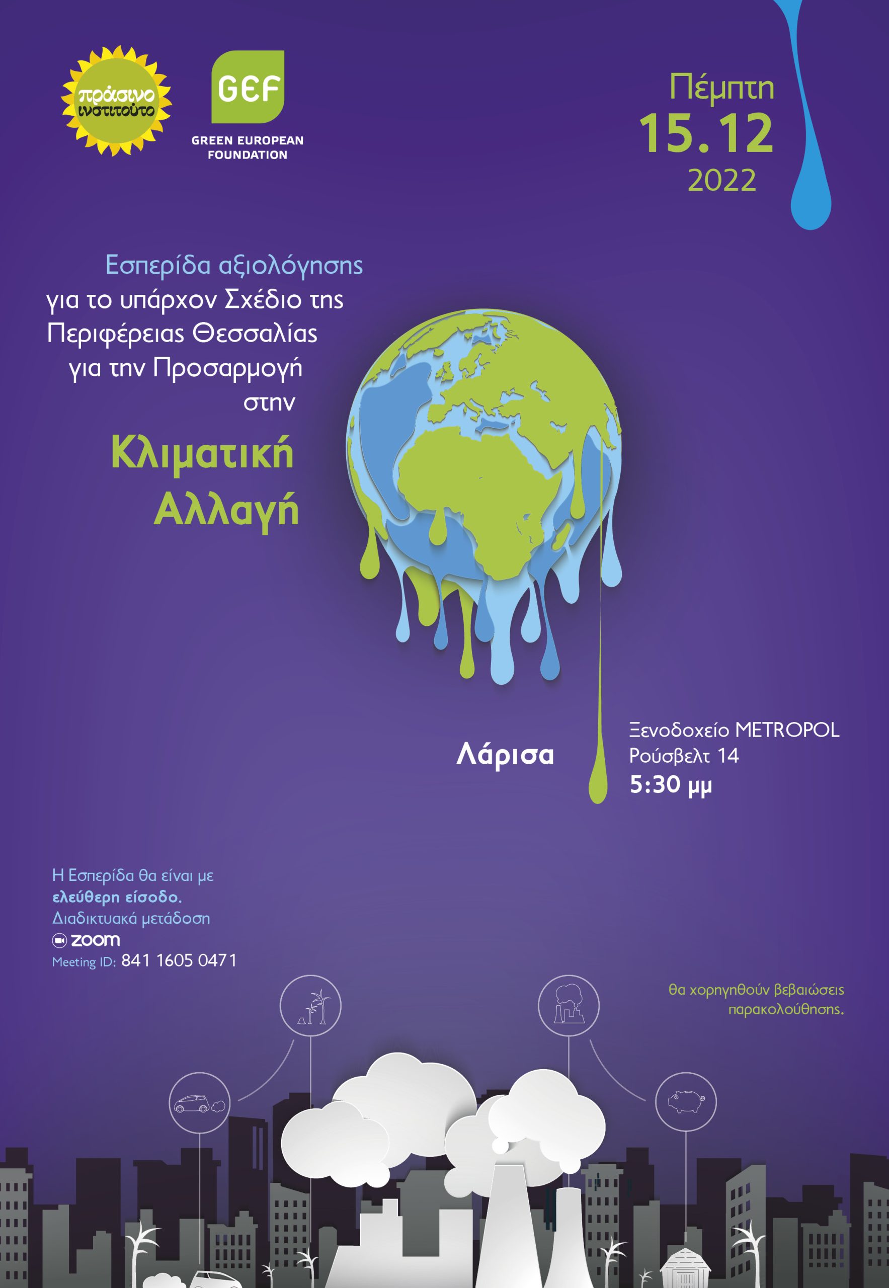 Η κλιματική αλλαγή απασχολεί έντονα τις χώρες αλλά και τους θεσμούς της Ευρωπαϊκής Ένωσης. Ένας από τους τομείς που επηρεάζονται δραματικά από τα ακραία καιρικά φαινόμενα είναι ο αγροδιατροφικός. Κάτω από αυτό το πρίσμα και με ξεκάθαρο προσανατολισμό στο περιβάλλον, το Πράσινο Ινστιτούτο έχει αναλάβει την υλοποίηση του έργου «Περιφερειακές Προσαρμογές στην Κλιματική Αλλαγή» για το 2022-2023 με τη χρηματοδότηση του Green European Foundation-GEF και την οικονομική υποστήριξη του Ευρωπαϊκού Κοινοβουλίου. Στο πλαίσιο αυτό πραγματοποιείται η ενδεικτική διερεύνηση της Κλιματικής Προσαρμογής τεσσάρων Περιφερειών της χώρας (Β. Αιγαίου, Κεντρικής Μακεδονίας, Θεσσαλίας, Πελοποννήσου), και οι προβλέψεις στα υπάρχοντα Περιφερειακά Σχέδια Προσαρμογής στην Κλιματική Αλλαγή (ΠεΣΠΚΑ). Έχουν πραγματοποιηθεί ήδη δυο εσπερίδες (Βόρειο Αιγαίο 22/11, Κεντρική Μακεδονία 5/12). Την Πέμπτη 15 Δεκεμβρίου πραγματοποιείται η τρίτη κατά σειρά εσπερίδα στο ξενοδοχείο METROPOL, Ρούσβελτ 14, στη Λάρισα.