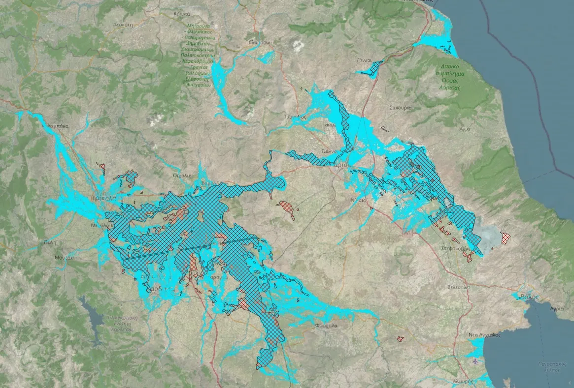 Στην εικόνα που παραθέτουμε, φαίνεται με μπλε χρώμα η ζώνη πλημμύρας 100 ετών. Με κόκκινα τετράγωνα η πλημμυρική ζώνη του φαινομένου Daniel όπως δημοσιεύτηκε σήμερα το πρωί από το Copernicus. Η ομοιότητα των δύο πλημμυρικών ζωνών, όπως αναφέρει ο υδραυλικός μηχανικός Άλης Ζαρκαδούλας, είναι τρομερά συγκλονιστική, όχι όμως ανεξήγητη.
