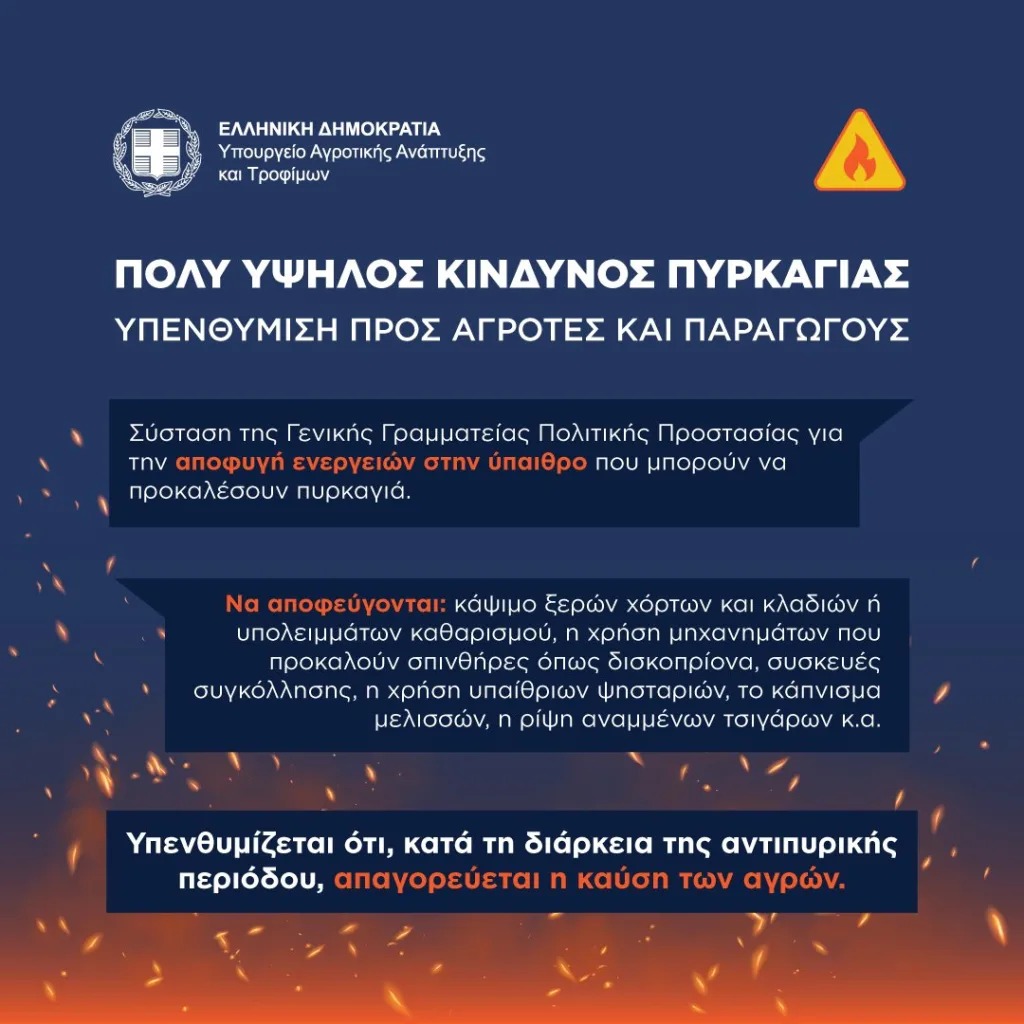 Η Γενική Γραμματεία Πολιτικής Προστασίας συνιστά στους πολίτες να είναι ιδιαίτερα προσεκτικοί και να αποφεύγουν ενέργειες στην ύπαιθρο που μπορούν να προκαλέσουν πυρκαγιά από αμέλεια, όπως το κάψιμο ξερών χόρτων και κλαδιών ή υπολειμμάτων καθαρισμού, η χρήση μηχανημάτων που προκαλούν σπινθήρες όπως δισκοπρίονα, συσκευές συγκόλλησης, η χρήση υπαίθριων ψησταριών, το κάπνισμα μελισσών, η ρίψη αναμμένων τσιγάρων, κ.α. Υπενθυμίζεται ότι κατά τη διάρκεια της αντιπυρικής περιόδου απαγορεύεται η καύση των αγρών.